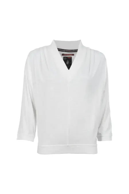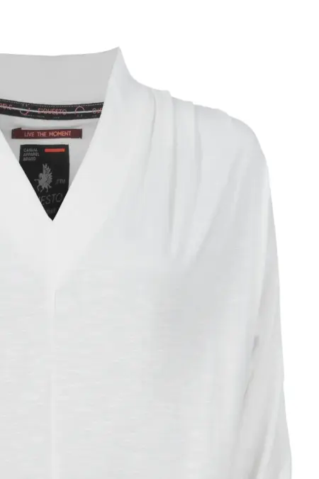 Hochwertiges Shirt in Flammgarn-Optik mit 3/4-Arm und femininem V-Ausschnitt. Die stilvollen Raffungen an den Schultern erzeugen eine zugleich spannende und dezente Optik. Perfekt kombinierbar zu einem S’questo Blazer.