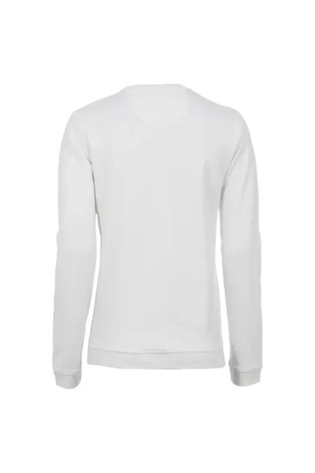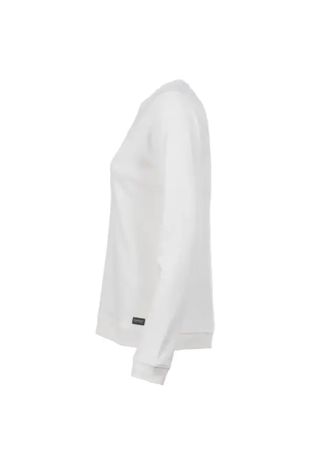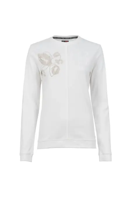 Rundhals Sweatshirt in angerauter Baumwollqualität. Die Vorderseite ziert ein tonales, asymmetrisches Artwork, das durch eine Teilungsnaht abgesetzt wird.