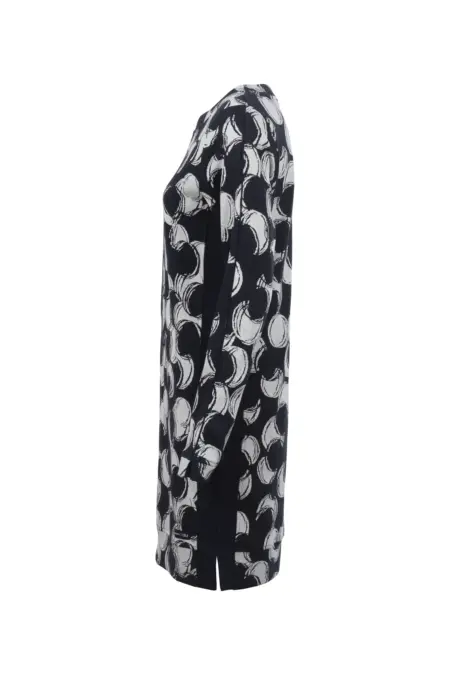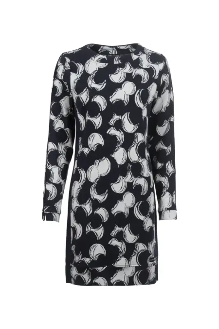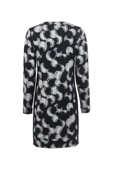 Komfortables Jacquard-Kleid mit langen Ärmeln und Rundhalsausschnitt. Durch das grafische Muster in Navy mit Weiß ist dieses Kleid zu jedem Anlass ein Hingucker und vielseitig kombinierbar.