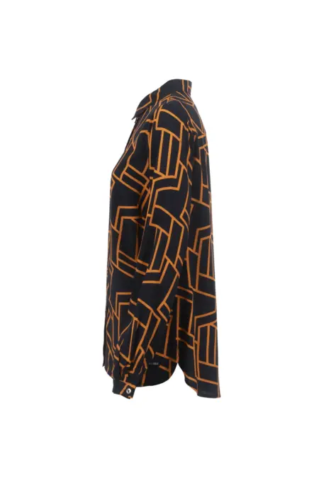 Durchgeknöpfte Bluse in klassischem Schnitt. Zum Hingucker wird diese Bluse durch den grafischen Allover-Print in knalligem Orange auf Navy Untergrund.