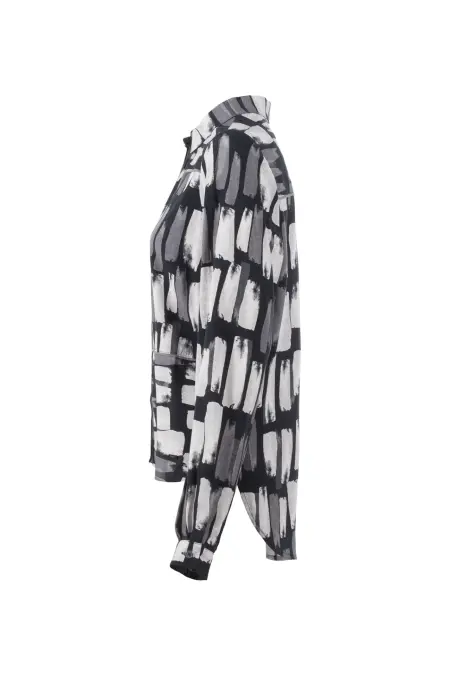 Klassisch geschnittene, durchgeknöpfte Bluse mit grafischem Allover-Print in modernem Design. Mit dezenten, grauen Pipings als weiteres, verspieltes Detail.