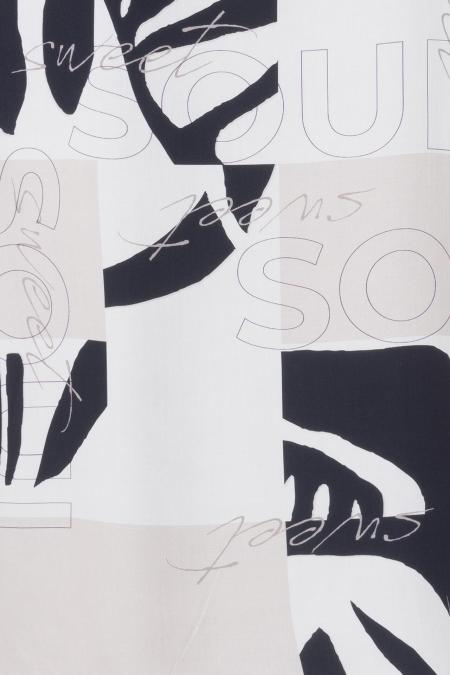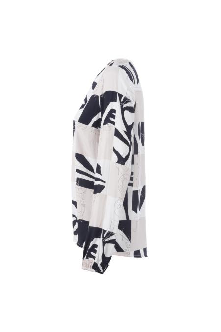 Luftige Bluse mit 1/1-Arm und Rundhalsausschnitt mit verspieltem V-Cut. Mit grafischem Allover-Print in harmonischer Farbgestaltung. Die Gummizüge an den Ärmeln und am Bund erzeugen eine feminine Silhouette.