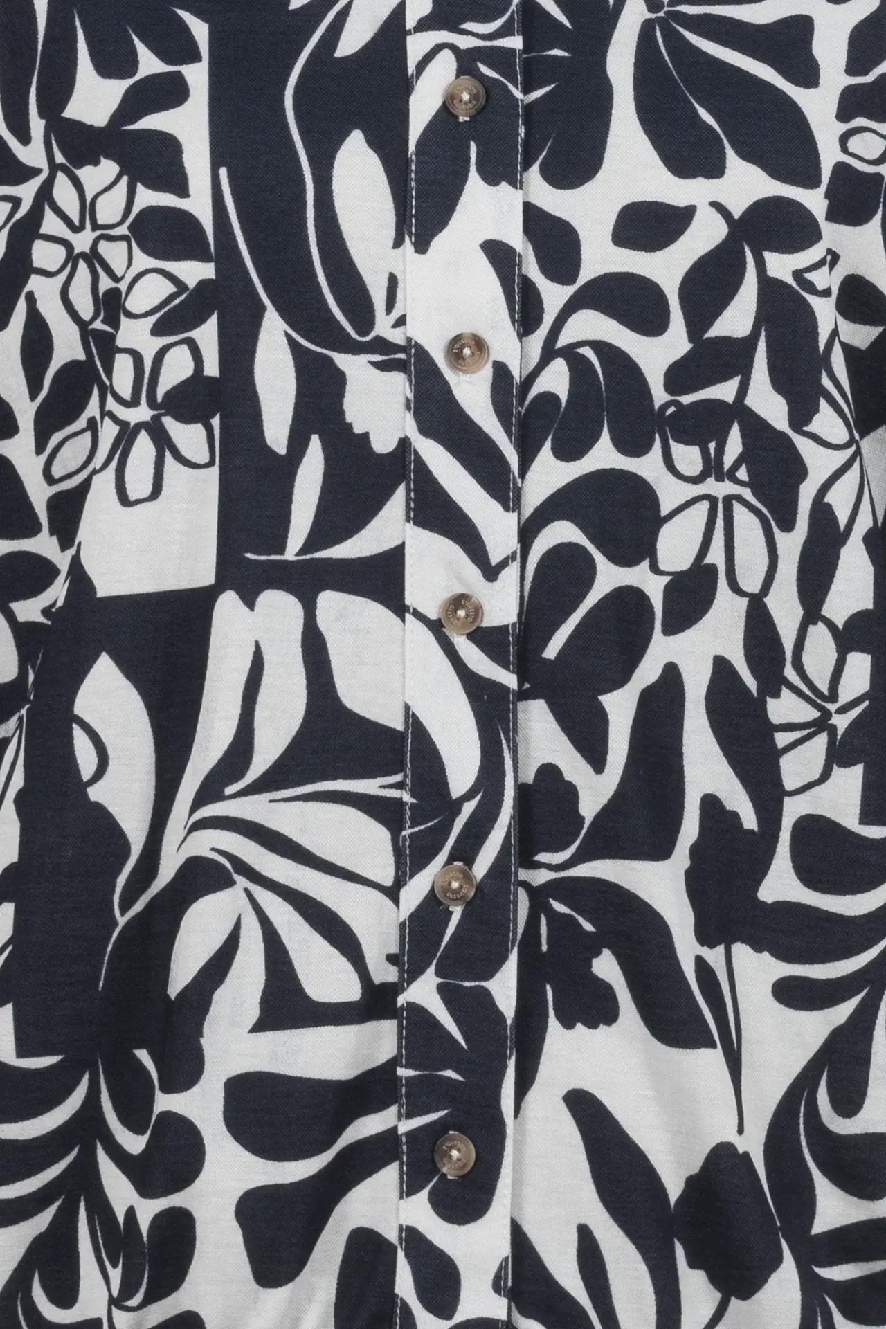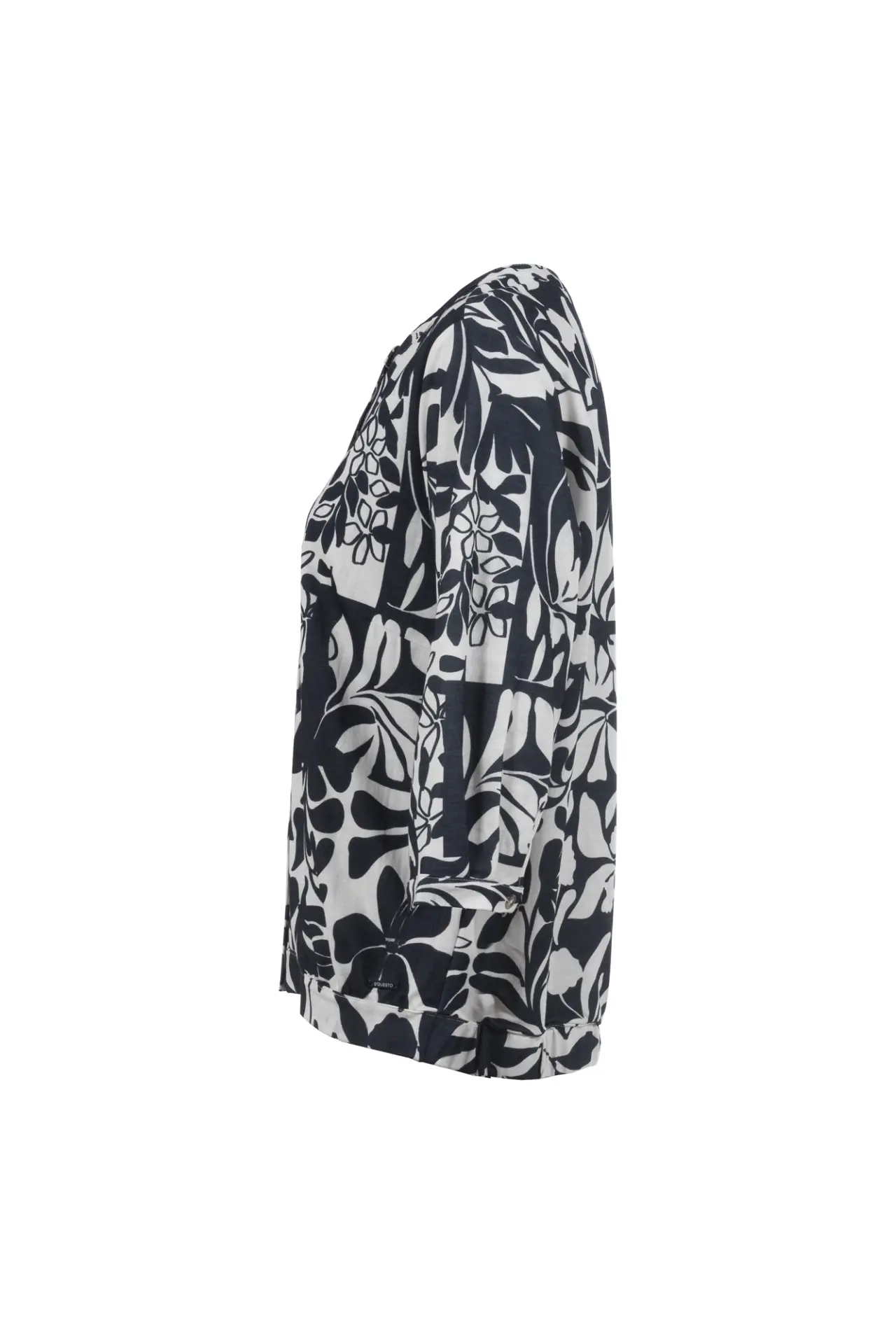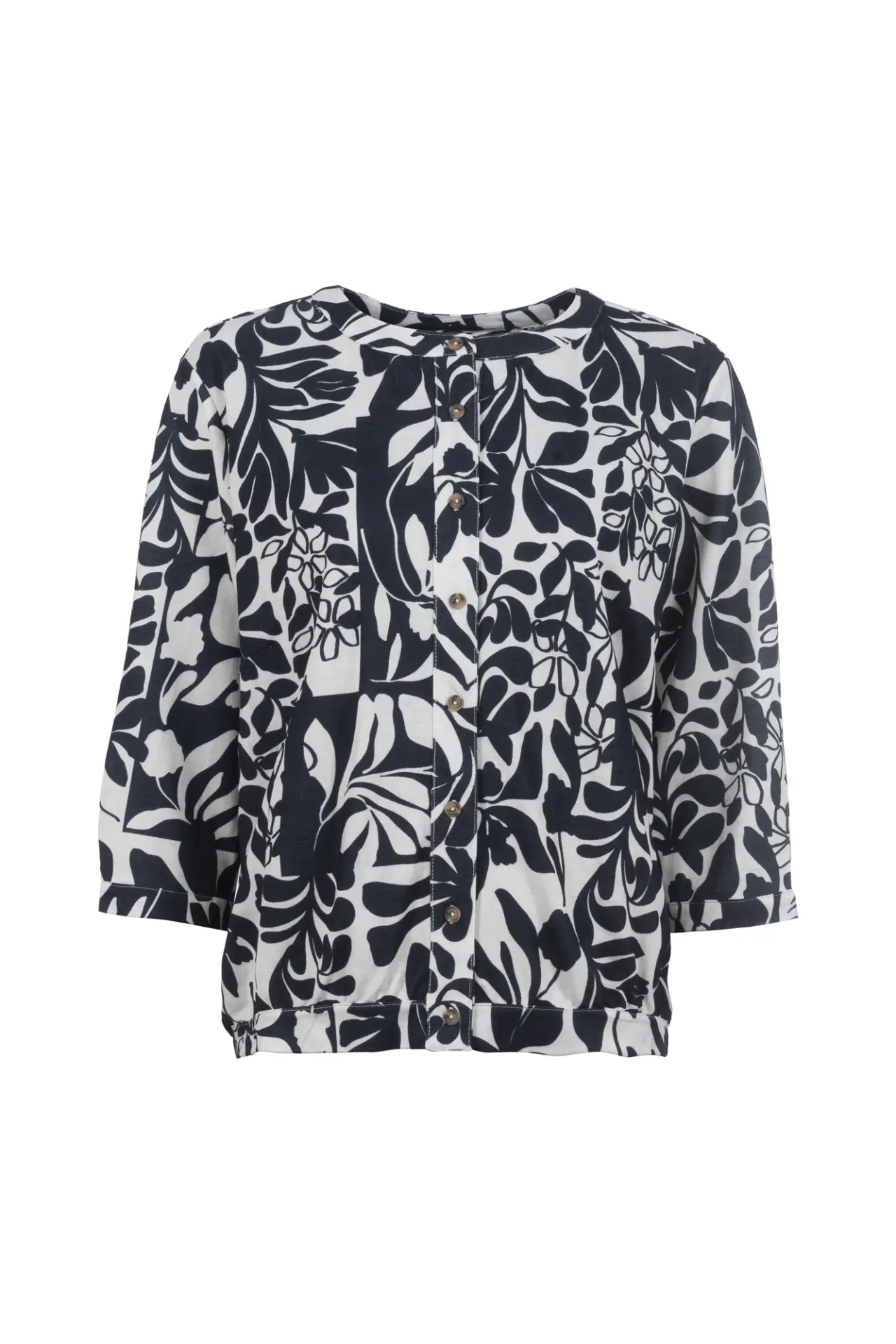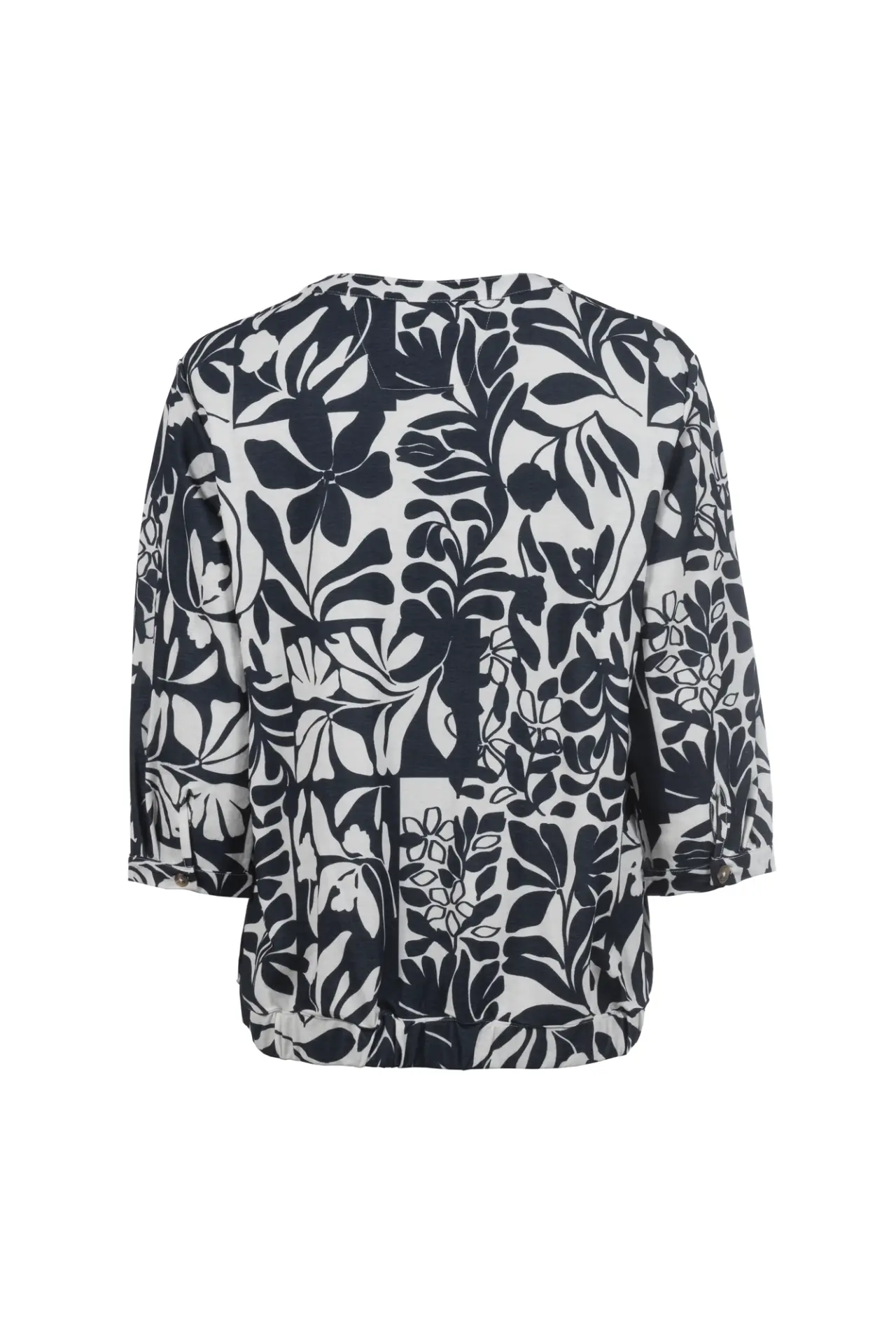 Diese Bluse kombiniert klassischen Charme und verspielte Details. Mit floralem Allover-Muster in den klassischen Farben Navy und Offwhite. Der Rundhalsausschnitt mit der durchgehenden Knopfleiste sowie die 3/4-Ärmel runden den Look ab und machen sie vielseitig kombinierbar.