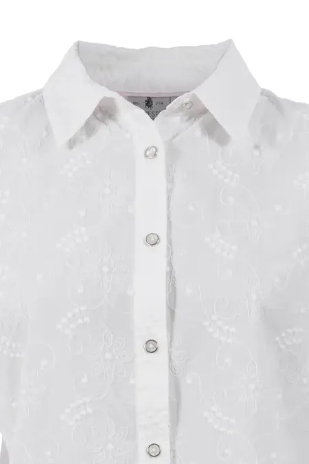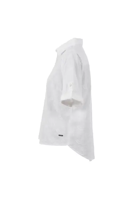 Durchgeknöpfte Bluse mit floralem Stickmuster. Die Ärmel haben einen Riegel, mit dem die umgeschlagenen Ärmel fixiert werden können. Die Bluse in Offwhite ist vielseitig kombinierbar und passend zu jedem Anlass.