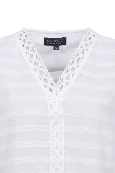 Ärmellose Bluse in klassischem Navy und Offwhite mit V-Ausschnitt. Das Spitzendetail verleiht der Bluse einen besonderen Touch und macht sie zu einem vielseitigen Kleidungsstück