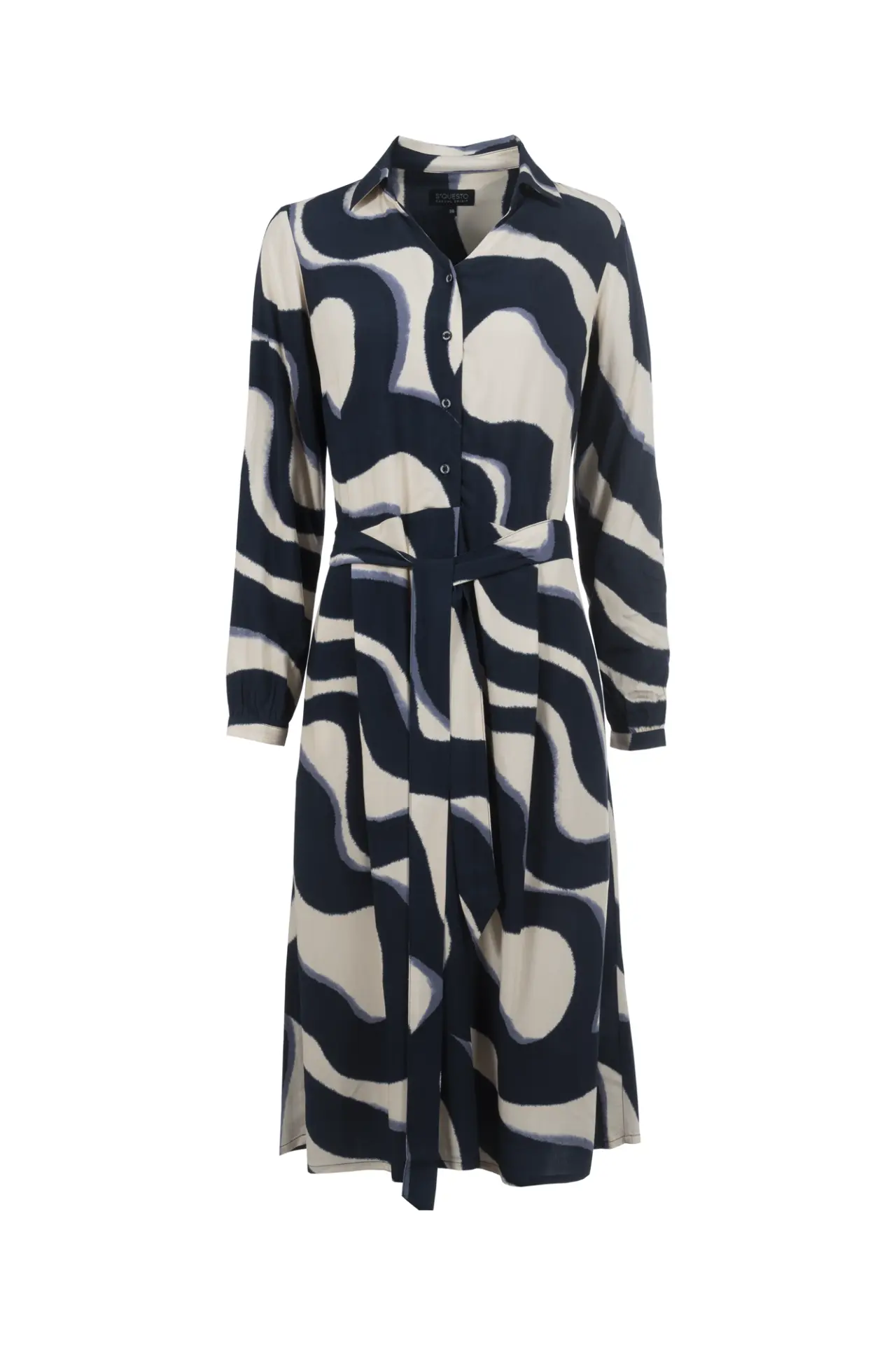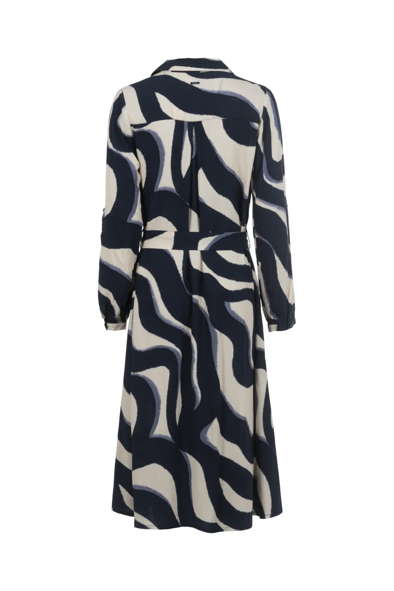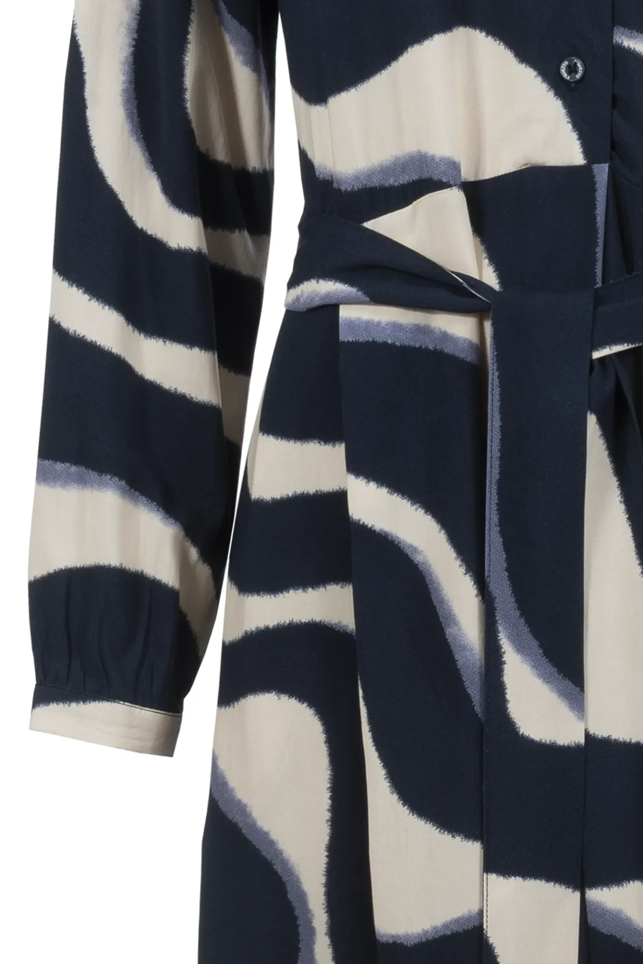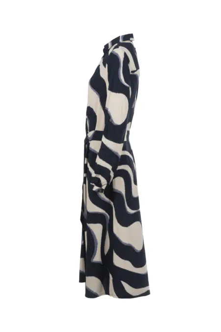 Modisches Webkleid in Midi-Länge mit grafischem Allover-Print. Der Blusenkragen und der Bindegürtel sorgen für eine gepflegte, feminine Silhouette. Die Ärmel lassen sich bequem krempeln und mit einem Riegel fixieren. Ein vielseitiger Begleiter für viele Anlässe.