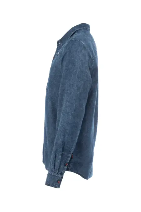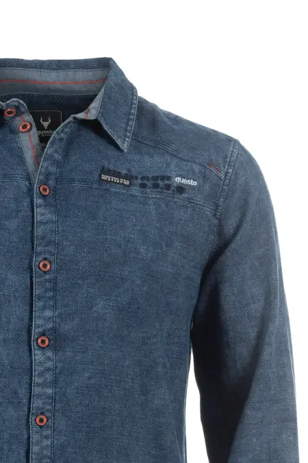 Langärmeliges Freizeithemd in Indigo. Das Hemd bekommt eine besonders lässige Optik durch die Waschung. Dieser lässige Look wird verstärkt durch eine Lettering-Stickerei auf der Brust.