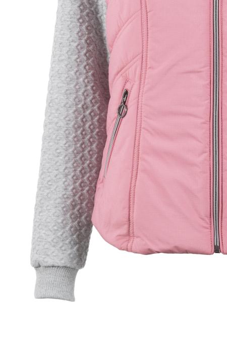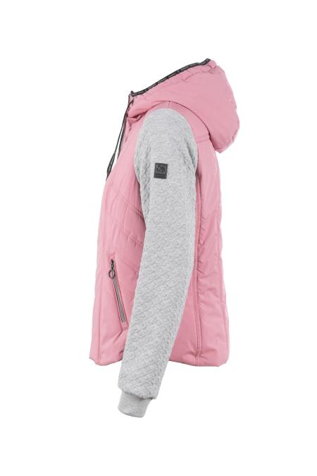 Schöne Mix & Match-Übergangsjacke mit Stehkragen und Kapuze mit Kordeln. Das Vorder- und Rückenteil der Jacke sind längs gesteppt. Die Ärmel aus Sweatware sind schön strukturiert und an den Enden mit elastischer Rippware versehen. Mit praktischen Eingriffstaschen mit Reißverschluss an den Seiten.