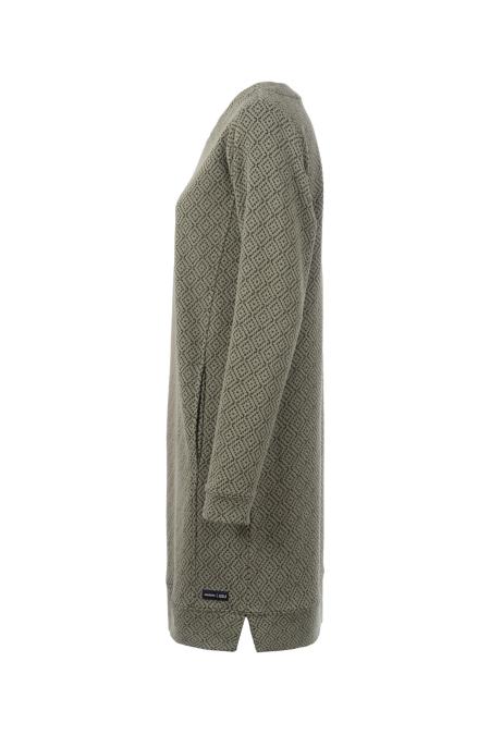 Jacquard-Kleid mit langen Ärmeln und kleinem V-Cut am Kragen. Das Kleid hat ein zeitloses Rautenmuster und formt eine schmeichelhafte Silhouette. Das Kleid kann im Alltag und zu schickeren Anlässen getragen werden.