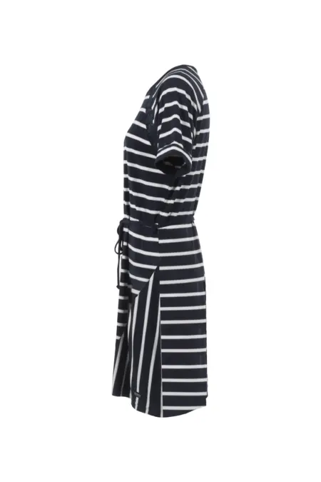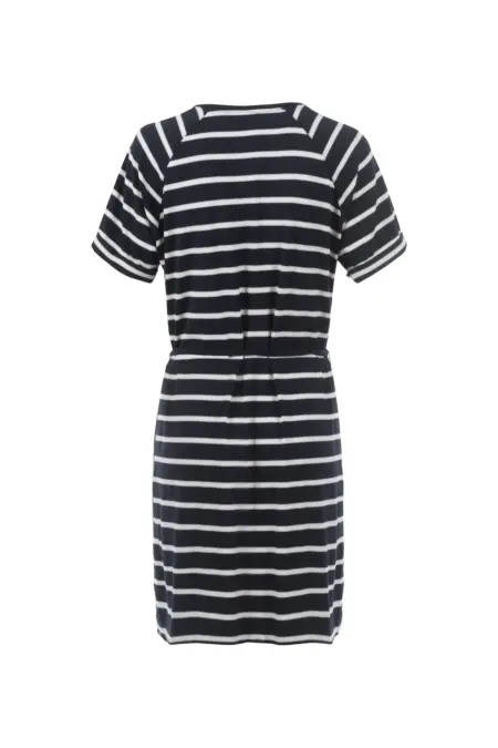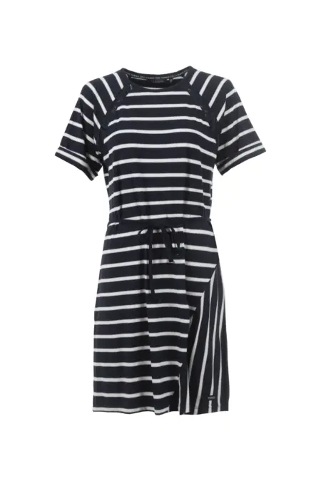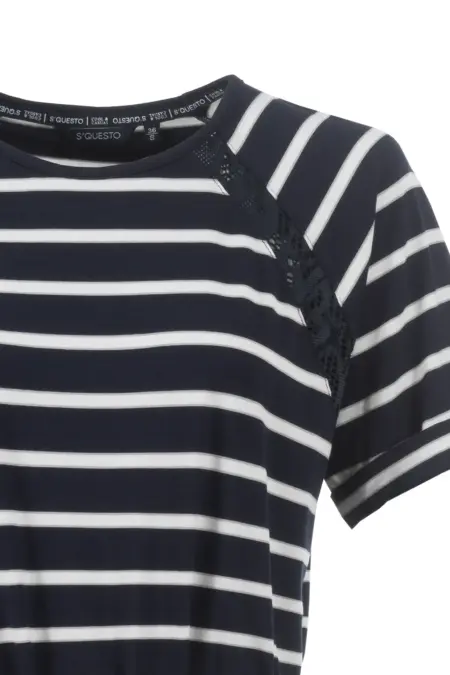 Legeres Jersey Kleid in Streifenoptik. Mit Rundhalsausschnitt und Comfort Sleeve. Durch kleine Spitzeneinsätze und einen zierlichen Gürtel zum Binden entsteht ein femininer Look.