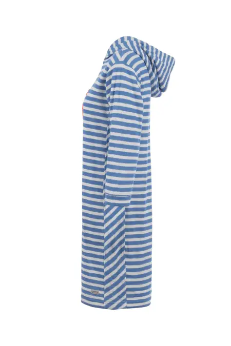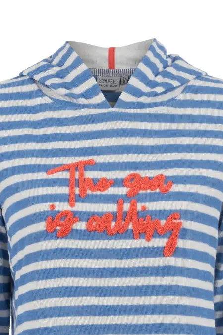Maritimes Freizeitkleid mit 3/4-Ärmel und Kapuze. Abgerundet wird der Look durch eine Lettering-Stickerei in modischer Teddy-Optik auf der Brust.