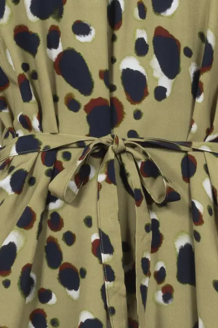 Webkleid mit 3/4-Arm und Rundhalsausschnitt. Es hat einen besonders femininen Look durch den Bindegürtel und eine Schleife am Rücken. Auch leichte Raffungen am Ausschnitt und den Ärmeln unterstreichen den Look. Mit grafisch-abstraktem Animal-Print.