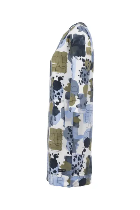 Komfortables Sweatkleid mit 3/4-Arm und Rundhalsausschnitt. Der markante Allover-Print in frischen Farben macht das Kleid zu einem Hingucker.