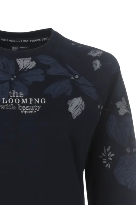 Das Sweatshirt mit Rundhalsausschnitt hat durch den Raglanarm und den breiten Bund einen sportiven casual Charakter. Ein großflächiger Blumenprint fügt einen femininen Touch hinzu. Abgerundet wird der Print durch ein zartes Lettering auf der Brust.