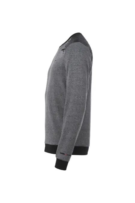 Rundhals Sweatshirt mit Nyloneinsätzen an der Schulterpartie. Der melierte Stoff mit einem platzierten, schwarzen Print an der Schulter erzeugt einen interessanten Look.