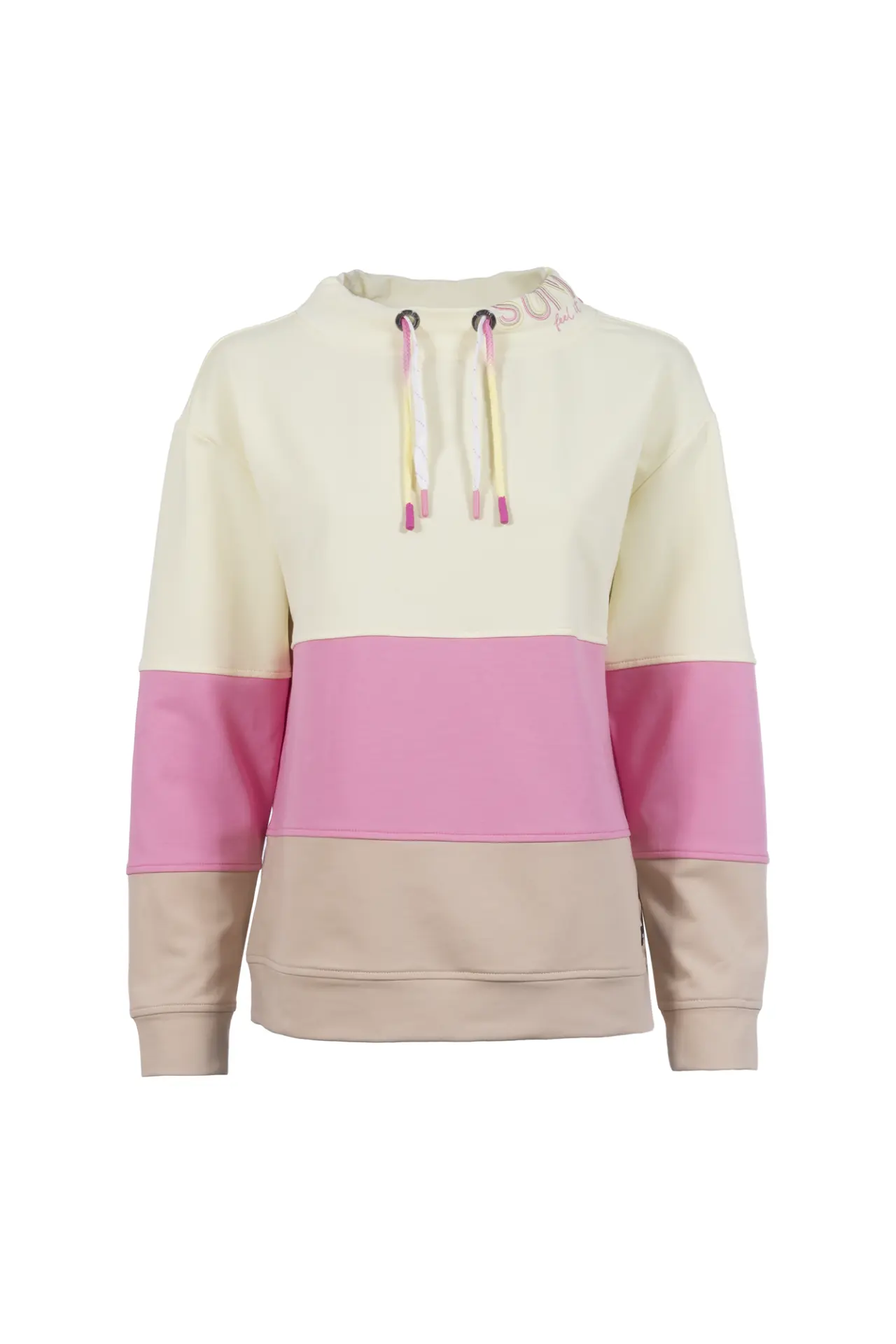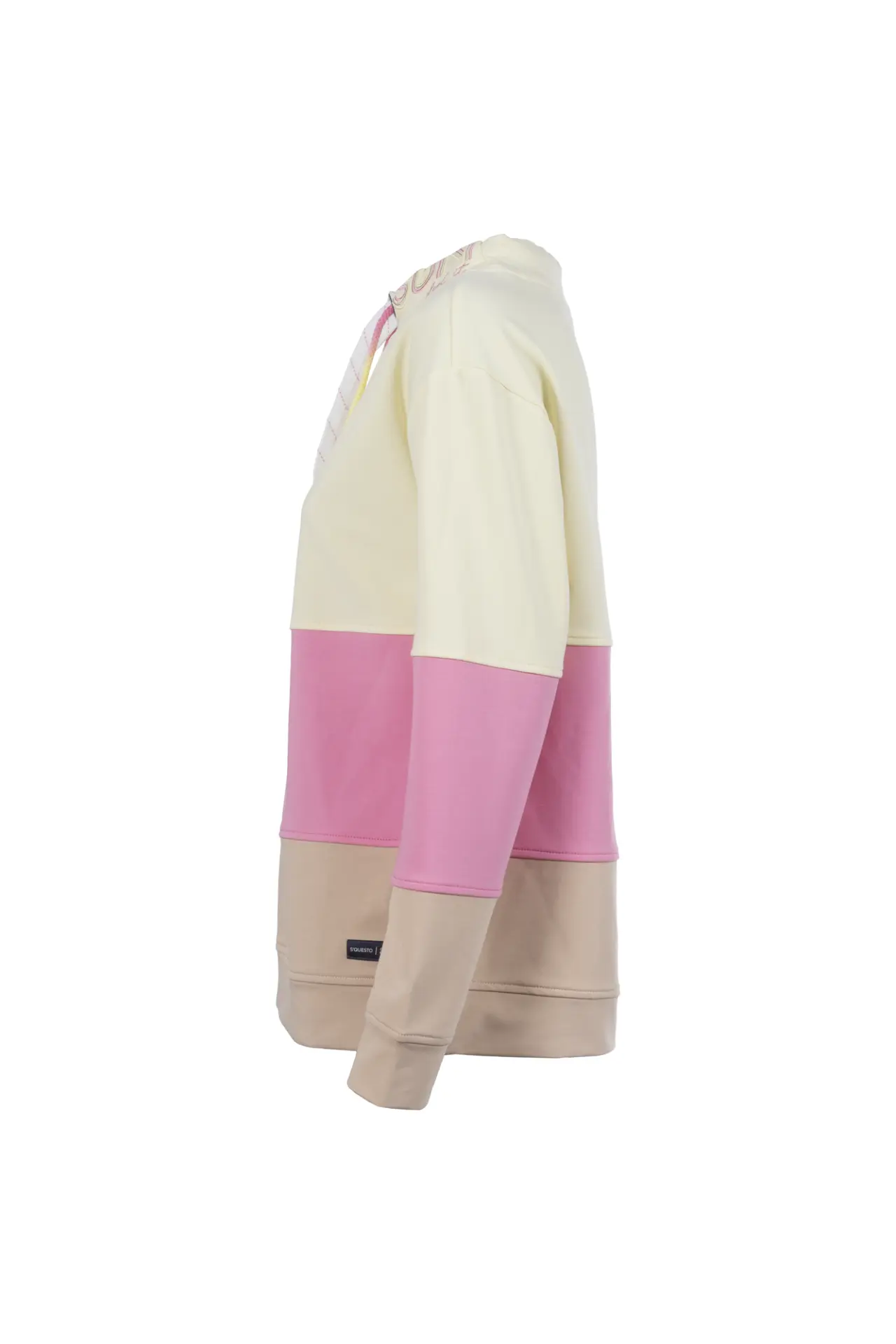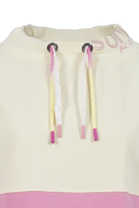 Das Sweatshirt überzeugt durch den Farbblock , der gute Laune macht. Überschnittene Schultern und farbenfrohe Kordeln am Stehkragen sorgen für einen lässigen Charakter. Abgerundet wird das Design durch eine hochwertige Lettering-Stickerei am Kragen.