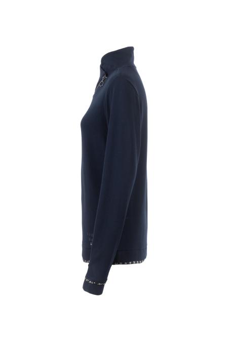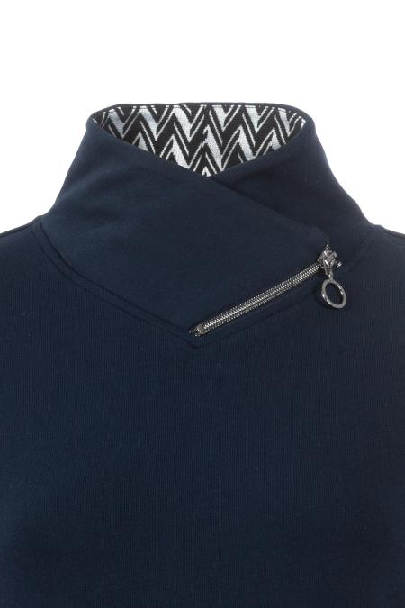 Detailverliebtes Sweatshirt in navy. Das Shirt setzt auf einen unifarbenen Gesamteindruck mit vielen kleinen Kontrastelementen in grafischem Allover-Design an Kragen, Ärmeln und Bund. Ein weiteres Detail ist der voluminöse Stehkragen mit Reißverschluss.