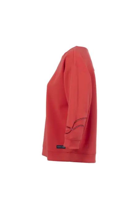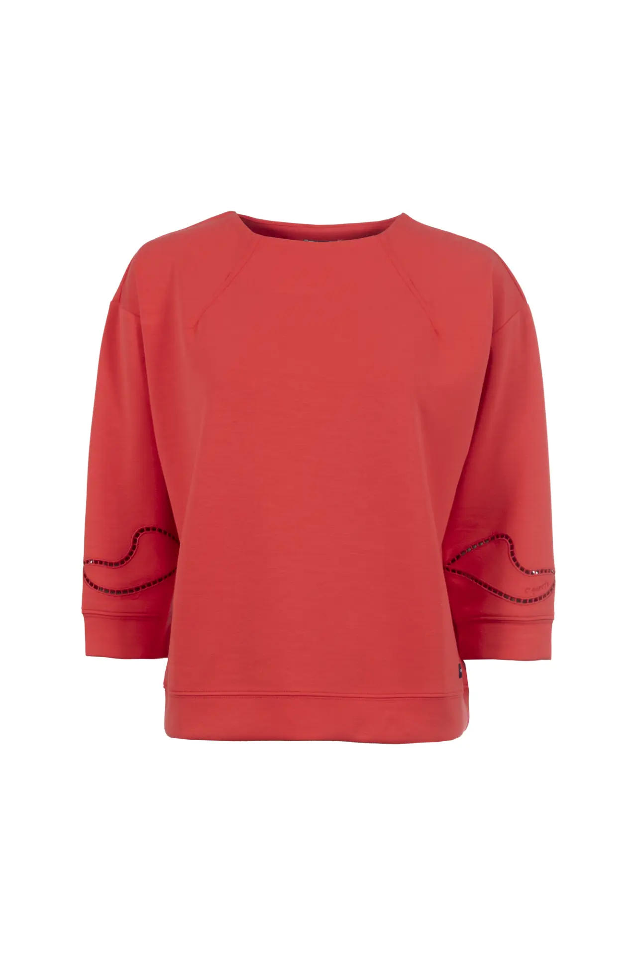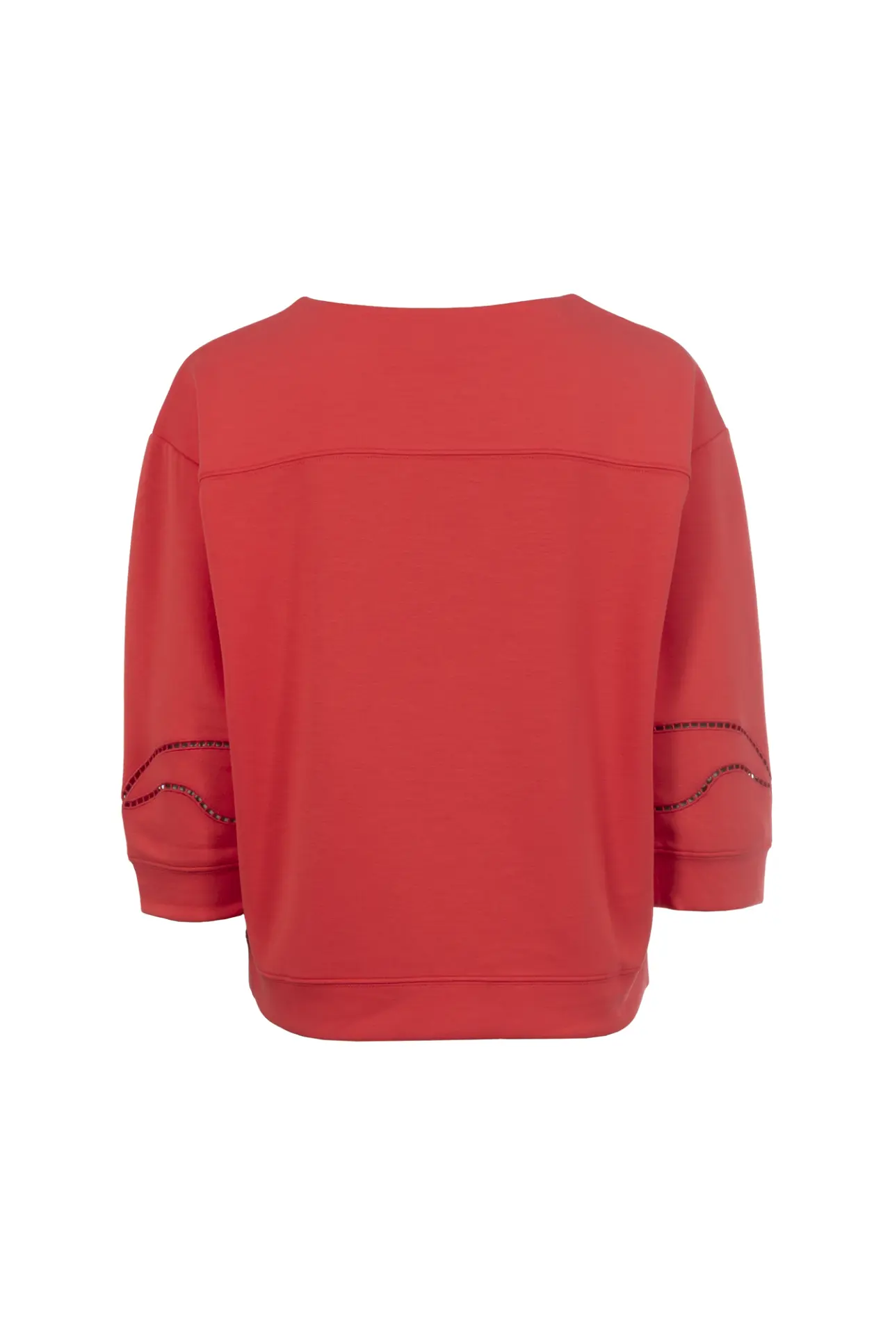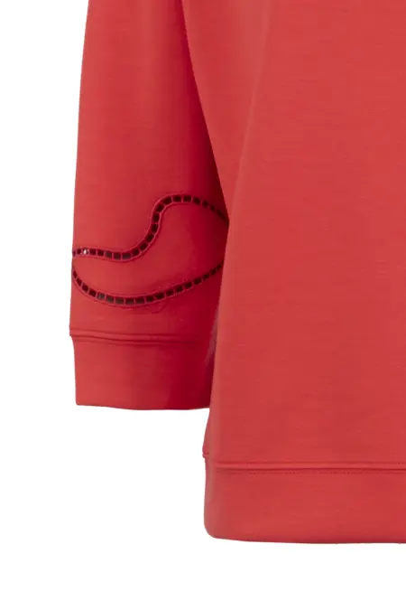 Das unifarbene Sweatshirt überzeugt mit vielen liebevollen Details. Die zarten Lochstickereien an den Ärmeln setzen ein feminines Highlight, während überschnittene Ärmel und dekorative Abnäher am Ausschnitt dem Shirt eine moderne, lässige Note verleihen.