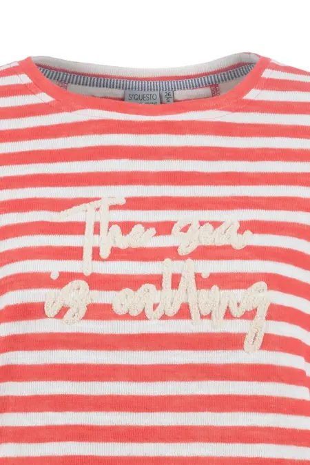 Gemütliches Sweatshirt in maritimer Streifenoptik mit 3/4-Arm und Rundhalsausschnitt. Abgerundet wird der Look durch eine hochwertige Lettering-Stickerei in Teddy-Optik auf der Brust.