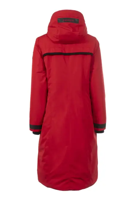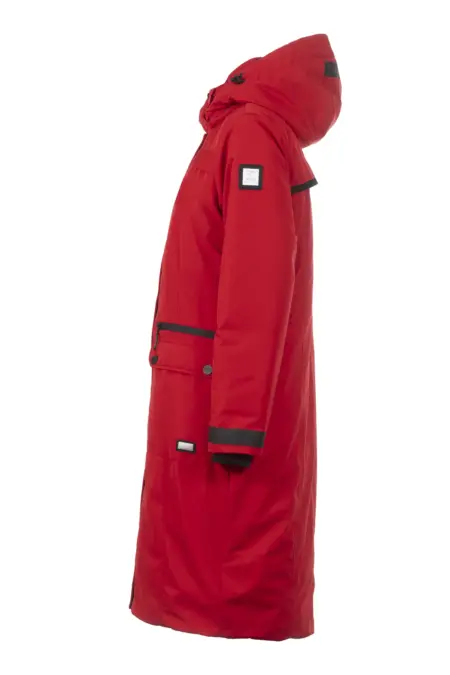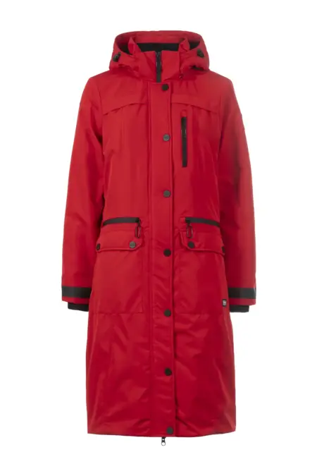 Die lange, ungesteppte Winterjacke ist in einem klassischen Cremeton oder in einem knalligem Rot erhältlich. Der Mantel zeichnet sich durch die kontrastigen Details und mehrere Taschen aus.