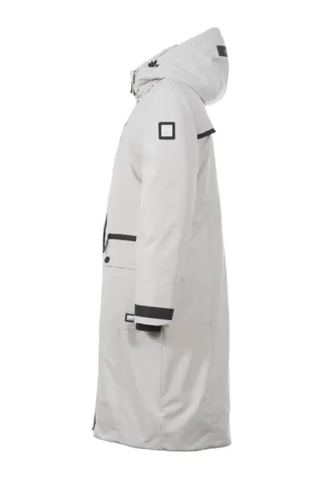 Die lange, ungesteppte Winterjacke ist in einem klassischen Cremeton oder in einem knalligem Rot erhältlich. Der Mantel zeichnet sich durch die kontrastigen Details und mehrere Taschen aus.