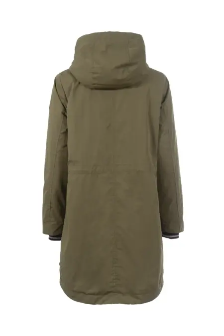 Ungesteppte Jacke in Khaki. Harmonische Farbakzente in Rosa verleihen der Jacke einen femininen Touch. Mit Kapuze und Taschen.