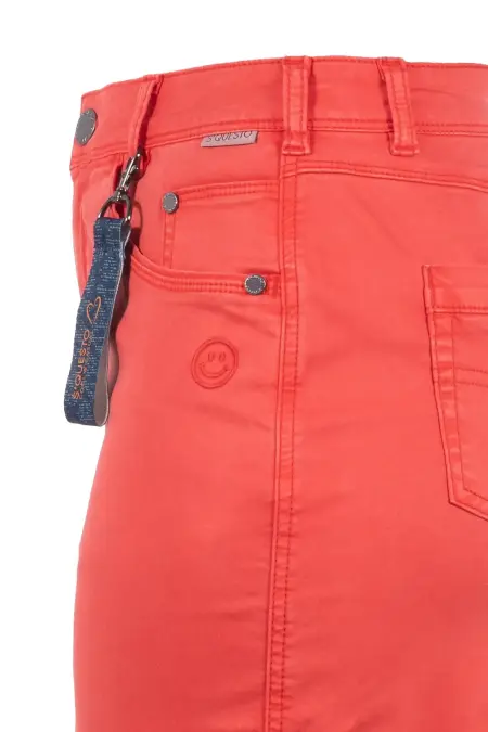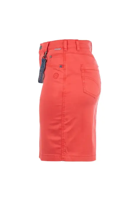 Der kurze Jeansrock in einem modischen Rot peppt jeden Kleiderschrank auf.