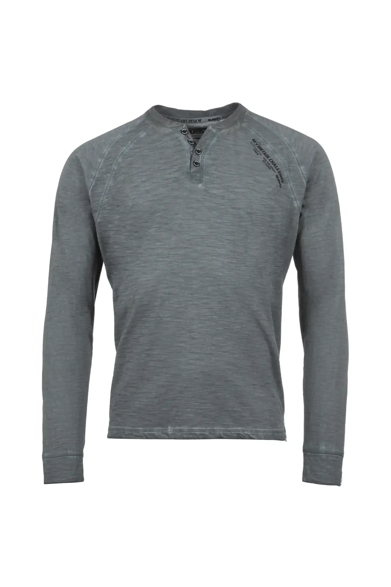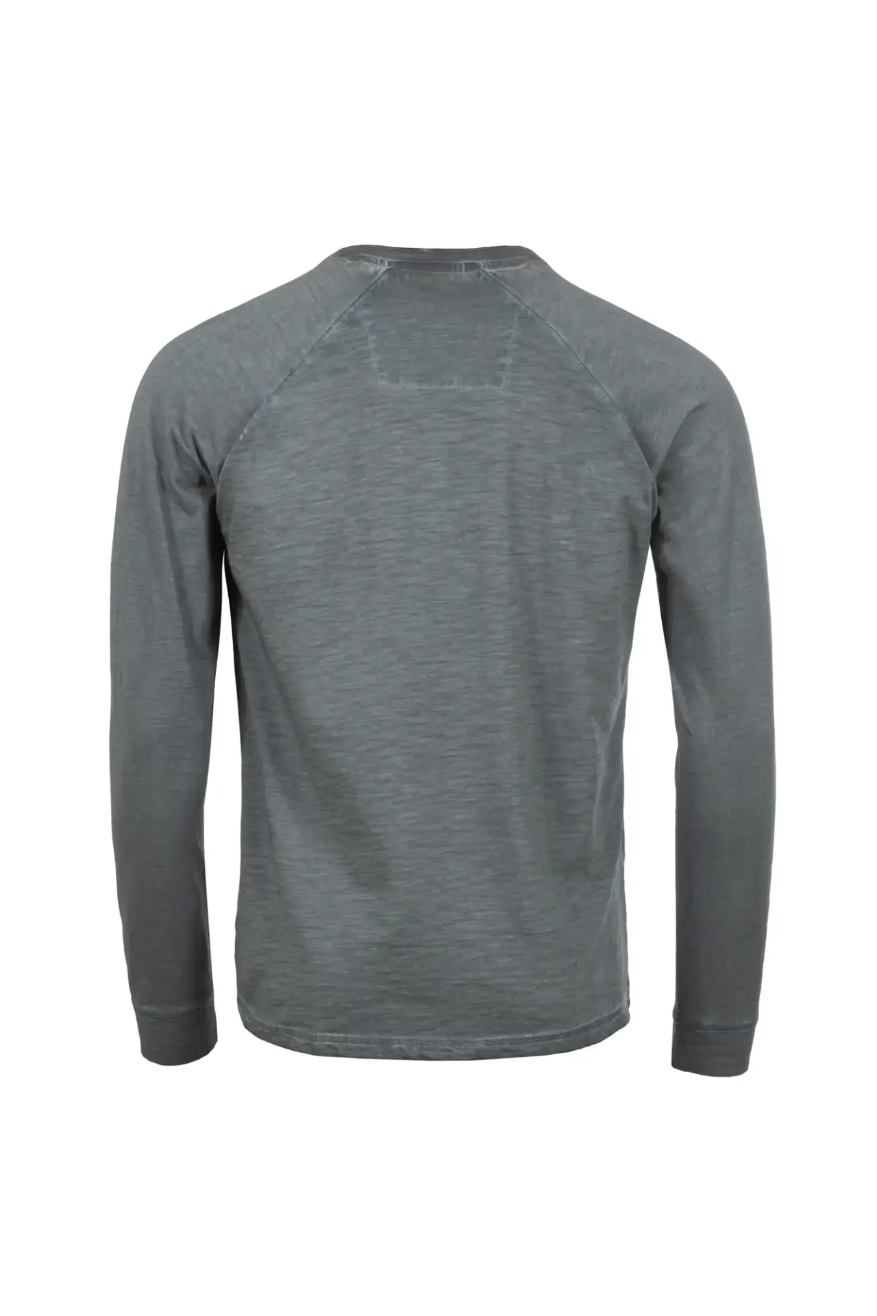 Lässiges Langarmshirt in Flammgarnoptik mit Henley-Kragen. Der Raglan-Ärmel und ein dezenter Lettering-Print an der Schulter unterstützen den casual Charakter des Shirts.