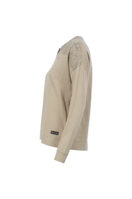 Langarm-Shirt aus 100% Baumwolle mit überschnittener Schulter für einene legeren Look. Mit kleinem V-Cut am Ausschnitt und grafischem Print in zarter Linienoptik an den Schultern. Abgerundet durch einen zarten Lettering-Print auf der Brust.