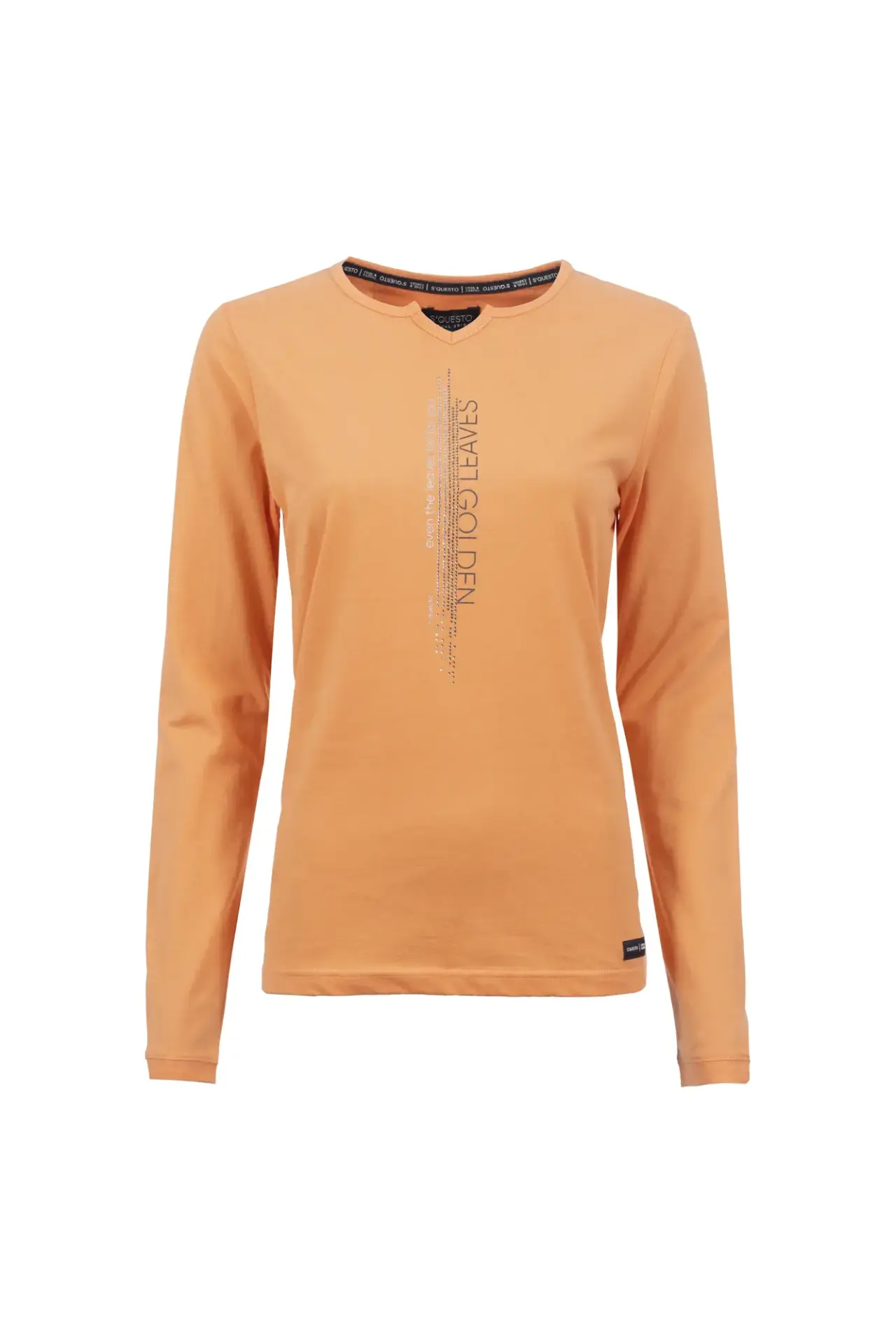 Dieses Langarmshirt vereint einen modischen Look mit Komfort. Das Shirt hat eine angenehme Passform, während zarte Glitzersteine und ein Lettering-Print den Look aufwerten – abgerundet durch den kleinen V-Cut am Kragen. Das Shirt kann perfekt mit einem S’questo Blazer oder einer Jacke kombiniert werden.