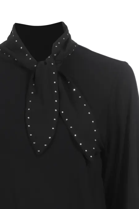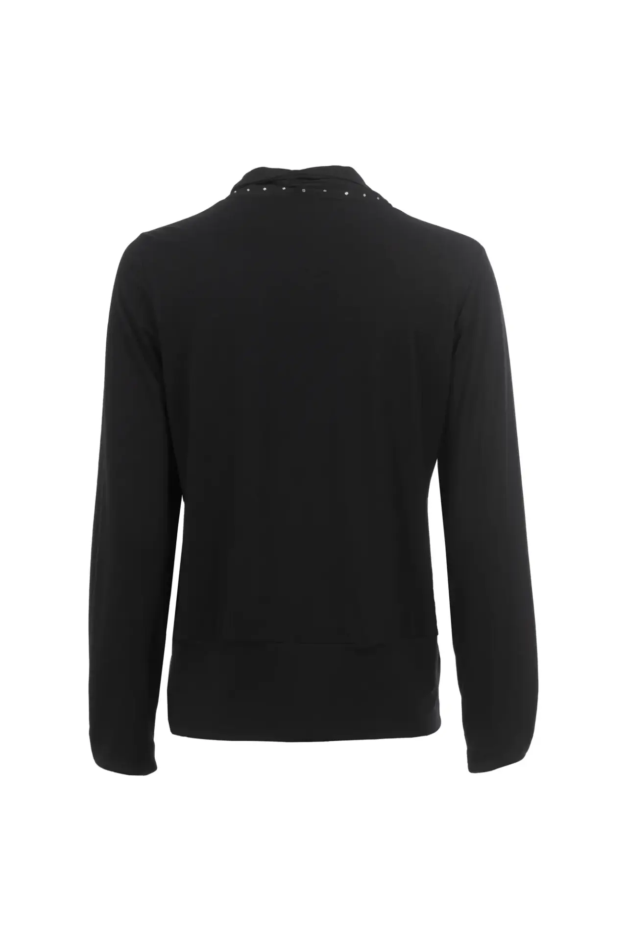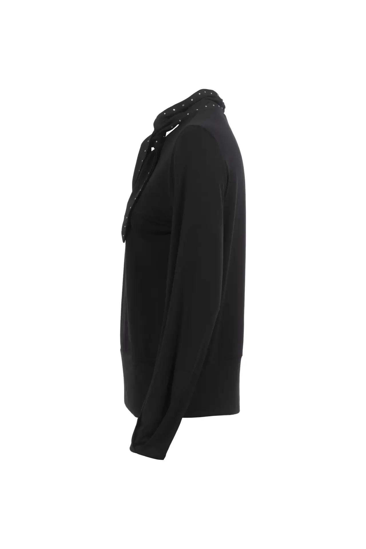 Einzigartiges Langarmshirt mit Schluppe und dezenten Nieten am Kragen. Das Oberteil besticht außerdem durch das fließende Material und den schmeichelhaften Schnitt mit breitem Bund. In klassischem Schwarz erhältlich ist das Shirt besonders einfach kombinierbar.