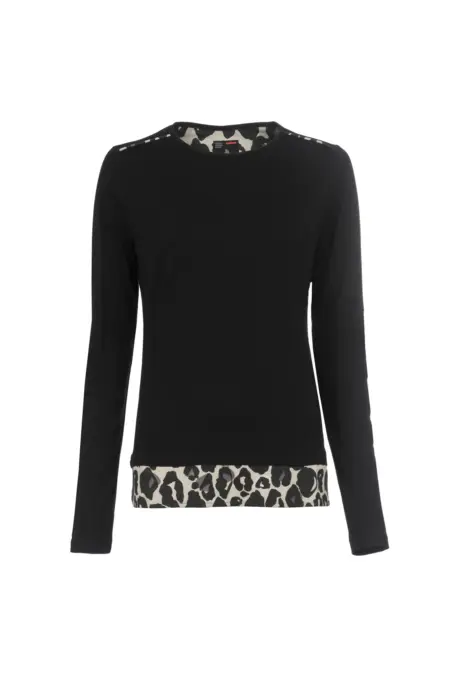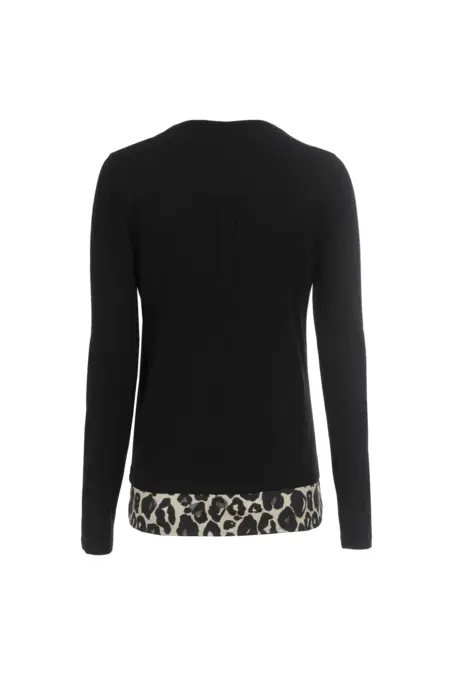 Das feminine Langarmshirt wird aufgepeppt durch Einsätze in modischem Leo-Muster am Bund und im Nacken, sowie durch Leo-Pipings an den Schultern. Ansonsten ist das Shirt in Schwarz gehalten, für ein harmonisches Gesamtbild.