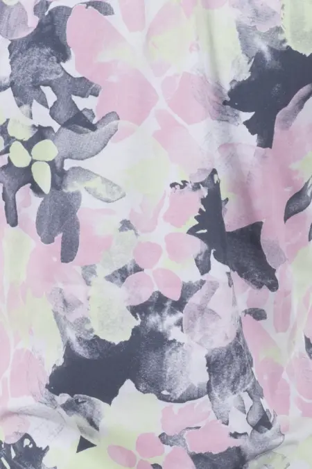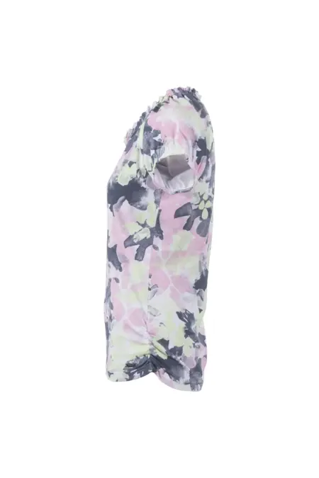 Verspieltes Carmenshirt mit zartem Blumenprint in Frühlingsfarben. Abgerundet wird der verspielte Look durch eine dezente Schleife am Ausschnitt.