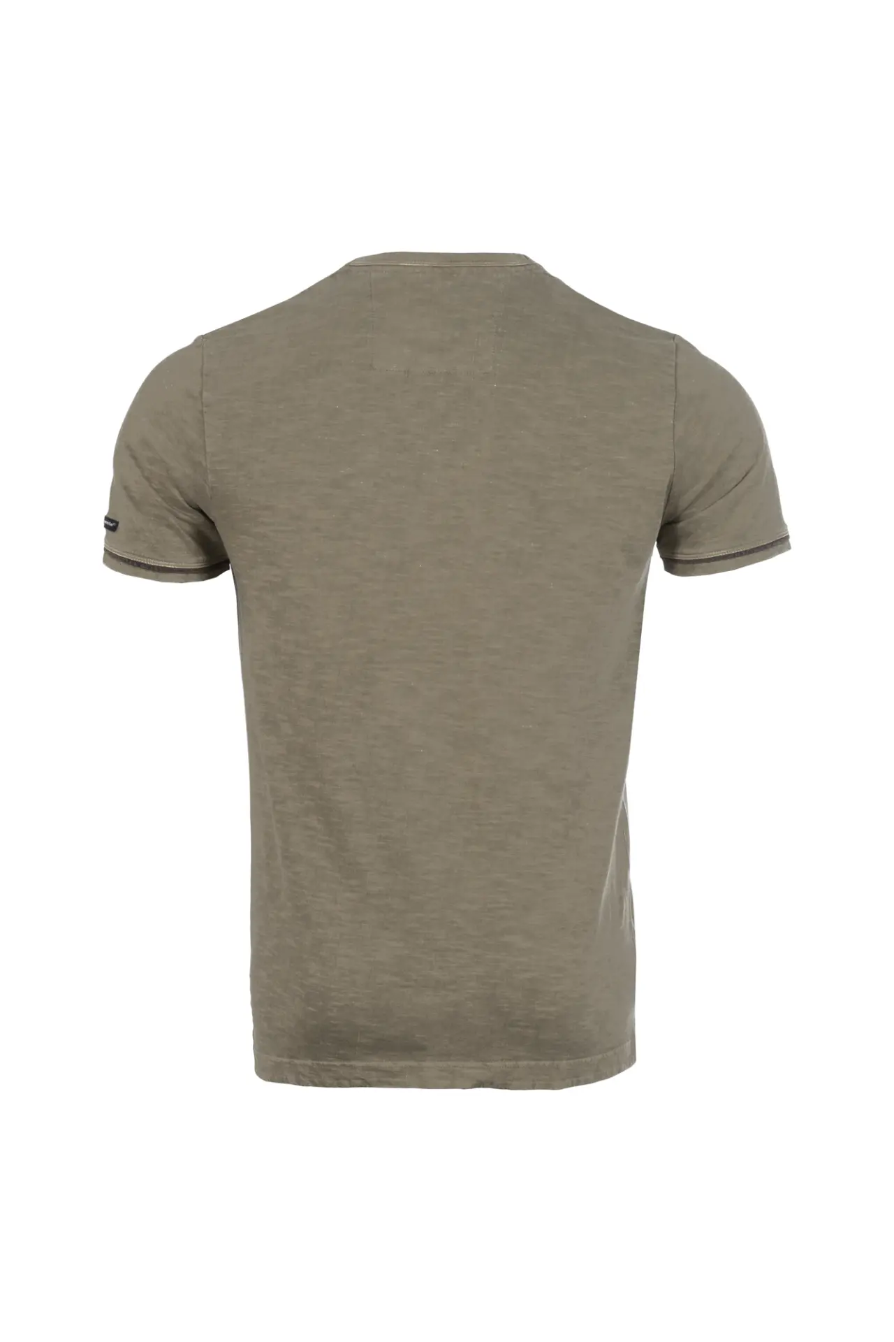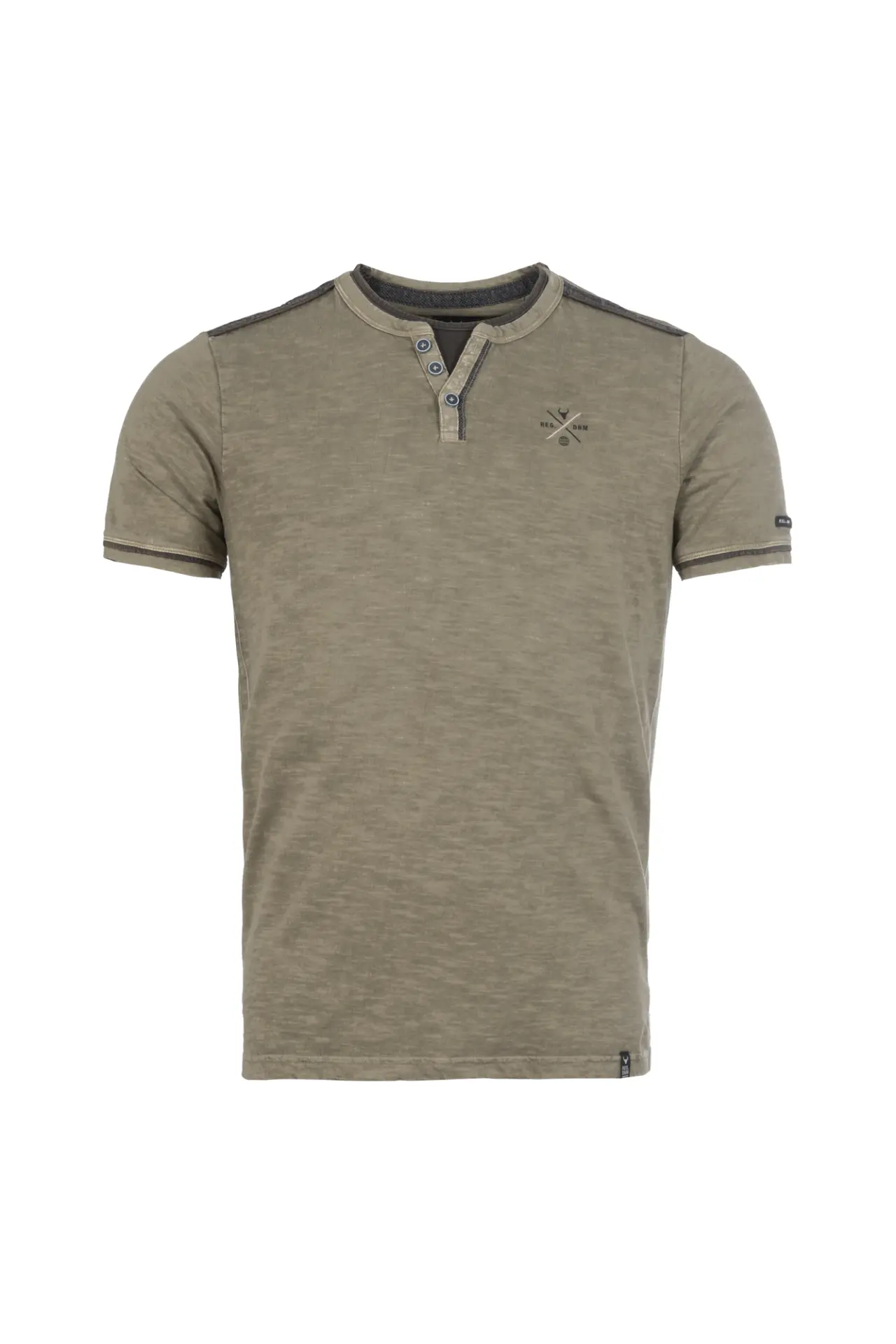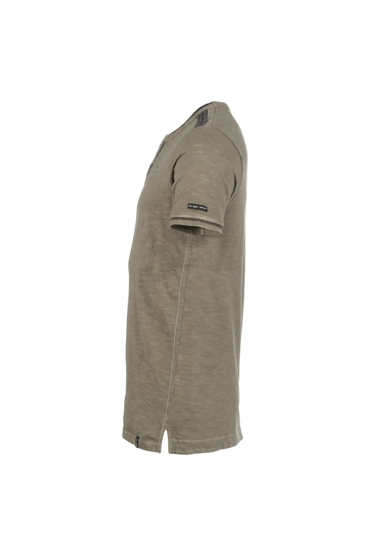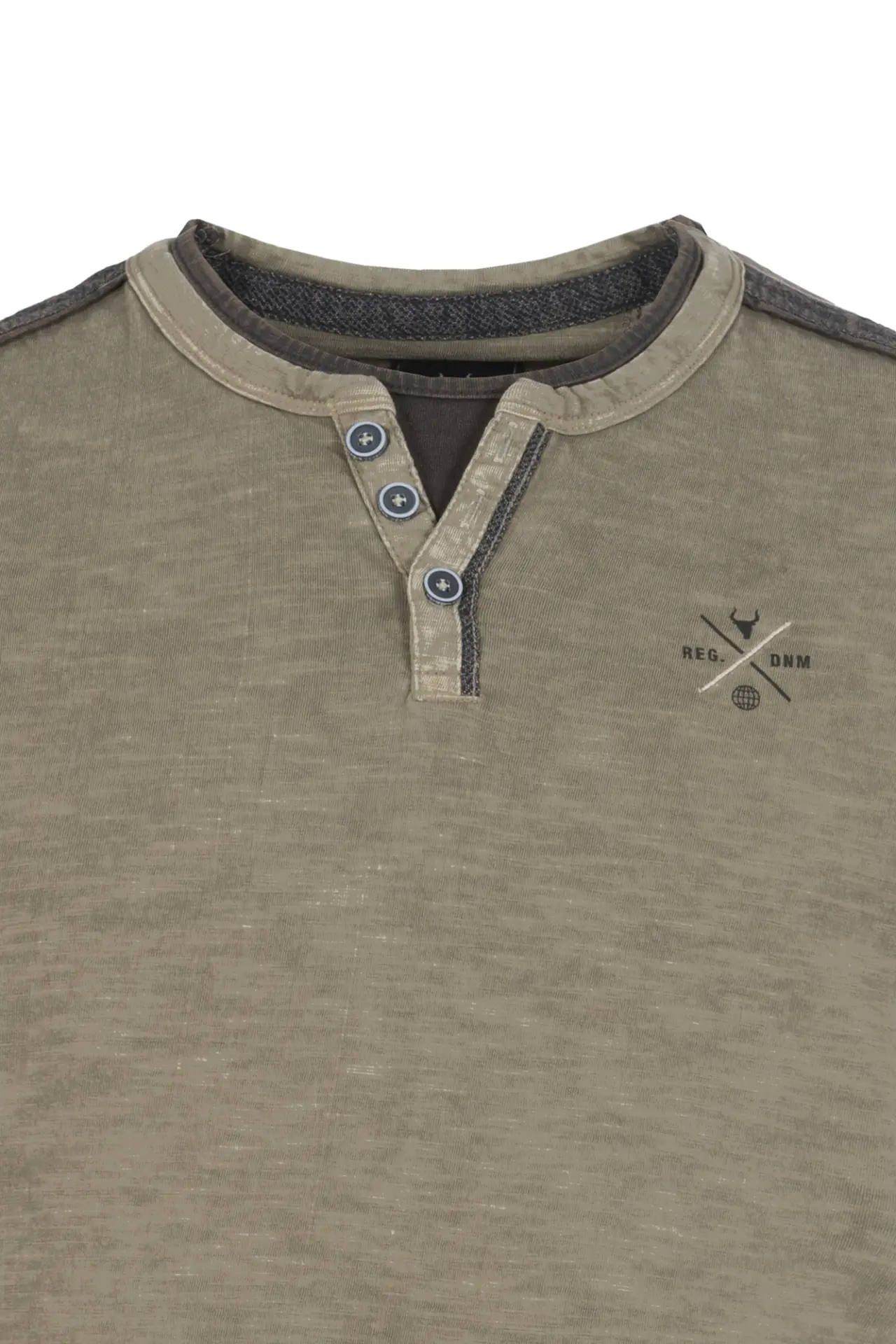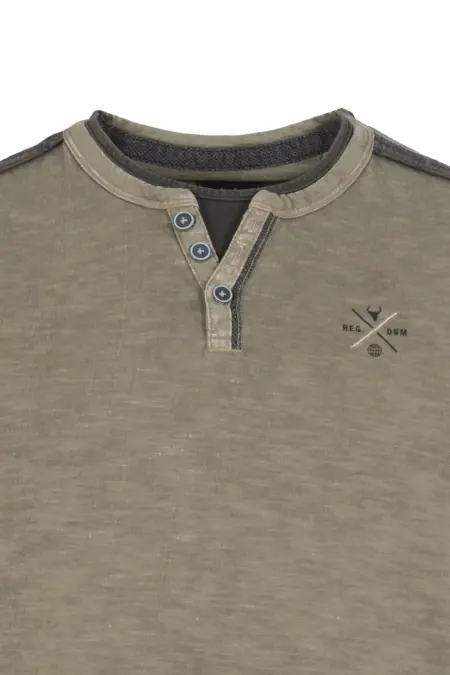 Lässiges T-Shirt in Flammgarnoptik. Mit unterlegter Knopfleiste passend zu den Einsätzen an Schultern und Ärmeln. Ein dezenter Brustprint mit Stickerei setzt einen zusätzlichen Akzent.