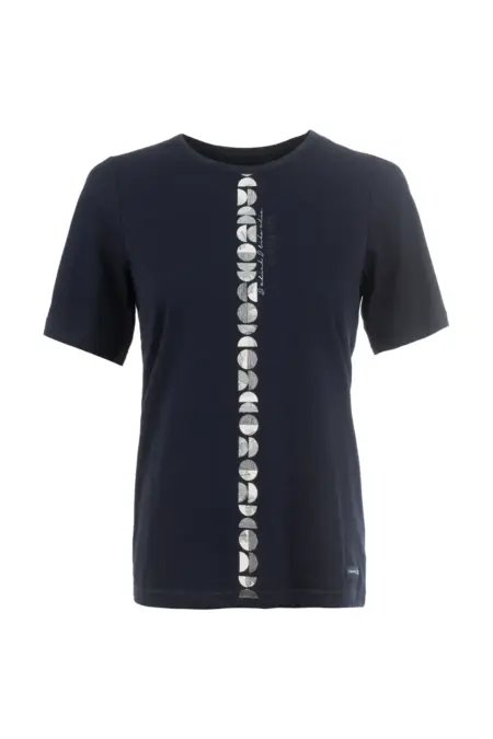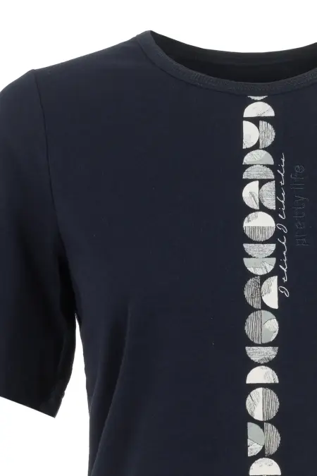 Legeres T-Shirt mit angenehmem Comfort Sleeve. Dieses Shirt macht der vertikale Print aus, welcher besonders mit einer offenen Jacke oder einem Blazer kombiniert zur Geltung kommt.