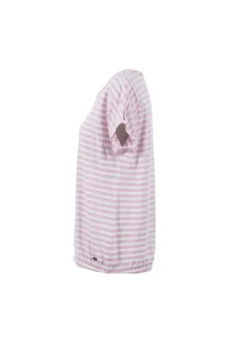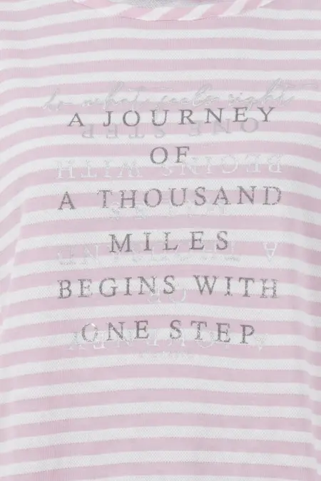 Modisches T-Shirt mit überschnittener Schulter und Comfort Sleeve. Das Shirt ist gestreift mit einem zarten Lettering-Frontprint mit dezenten Glitzerelementen als besonderes Highlight.