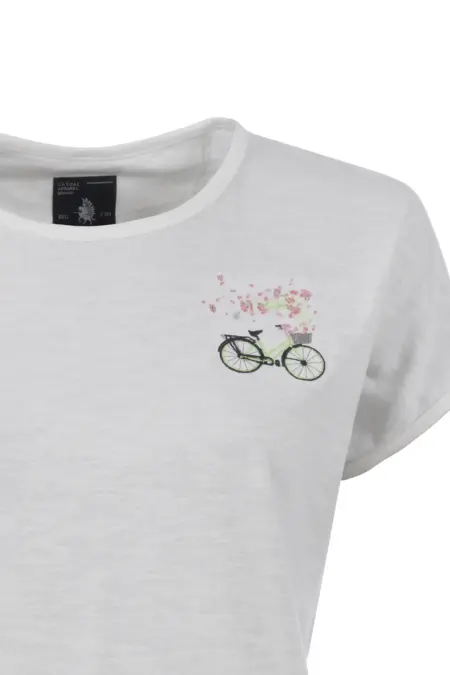 Das Highlight dieses T-Shirts in Flammgarn-Optik ist das süße Fahrrad-Motiv mit Blümchen Stickereien auf der Brust. Mit Rundhalsausschnitt und überschnittener Schulter.