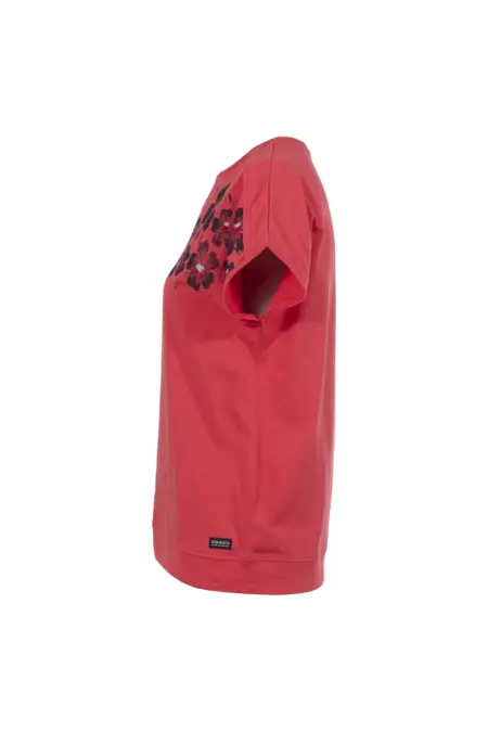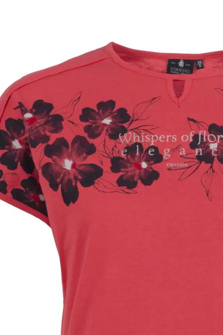 Feminines T-Shirt mit Frontprint bestehend aus floralen Elementen und zartem Lettering. Unterstrichen wird der feminine Look durch einen kleinen Cut-Out am Ausschnitt und die überschnittenen Ärmel. Ideal für einen unkomplizierten, alltagstauglichen Stil.