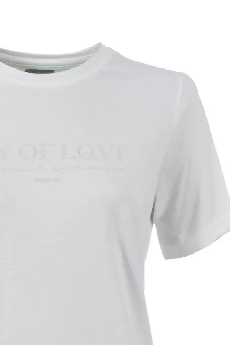 Schlichtes T-Shirt mit zartem Lettering-Print. Mit Rundhalsausschnitt und kleinem Ärmelaufschlag als feminines Detail.