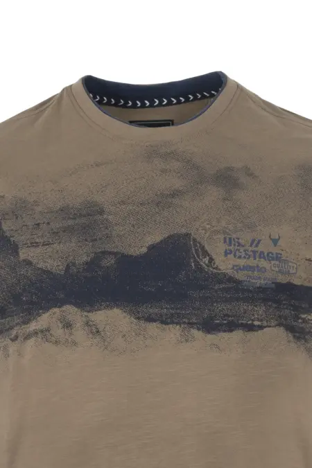 Flammgarn Rundhals T-Shirt mit einem Print auf der Brust. Ein besonderes Detail sind die Pipings an Ärmel- und Halsausschnitt in Kontrastfarbe.