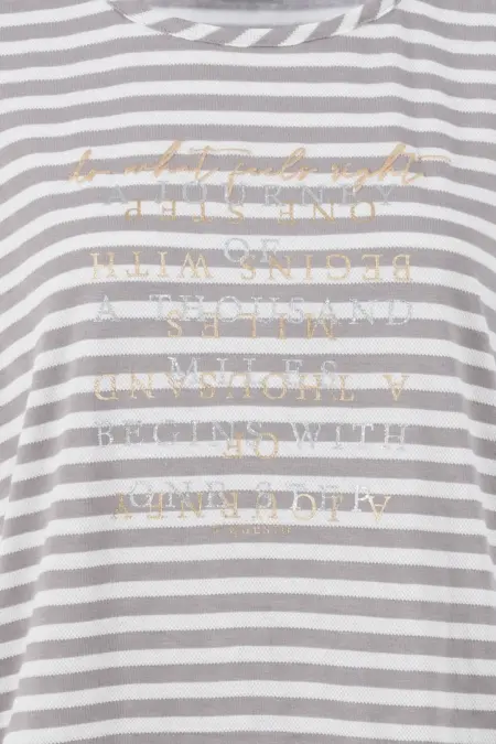Modisches T-Shirt mit überschnittener Schulter und Comfort Sleeve. Das Shirt ist gestreift mit einem zarten Lettering-Frontprint mit dezenten Glitzerelementen als besonderes Highlight.