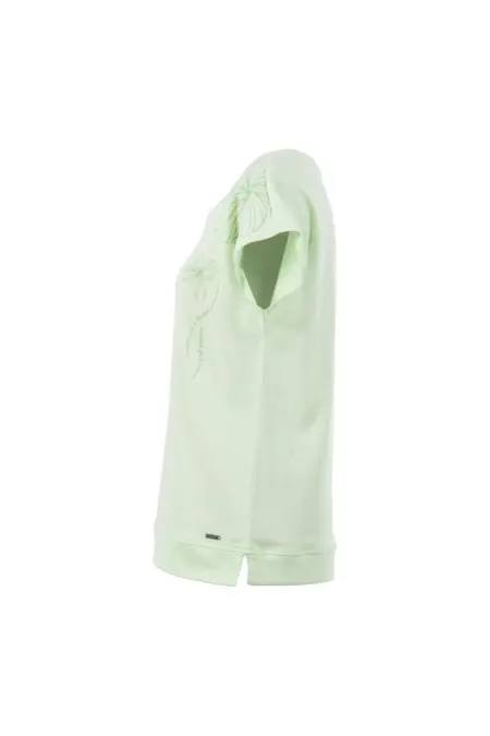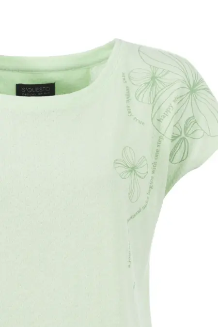 T-Shirt mit spannender Dobby-Struktur und überschnittener Schulter. Abgerundet wird der feminin-legere Eindruck durch ein florales Motiv in tonaler Farbgebung auf der Schulter.