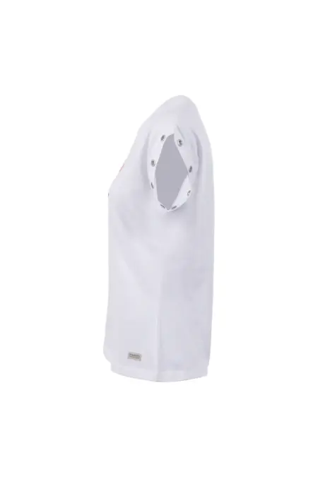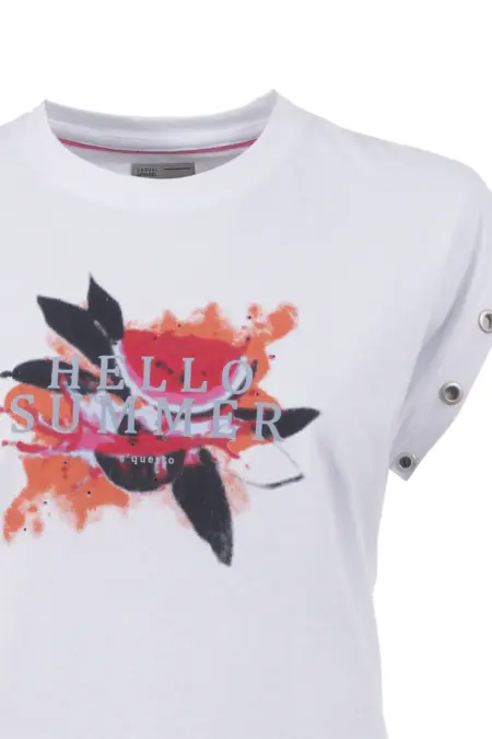 Auffälliges T-Shirt mit aufwendigem Frontprint mit Strasssteinen. Weitere Akzente setzten die coolen Metallösen an den Ärmeln.