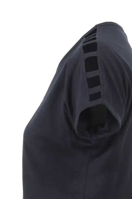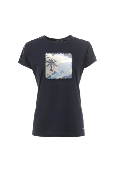 T-Shirt mit sommerlichem Frontprint in strahlenden Farben. Die Cut-Outs an den Schultern unterstreichen den sommerlichen Look. Das Shirt hat überschnittene Schultern und einen Rundhalsausschnitt.