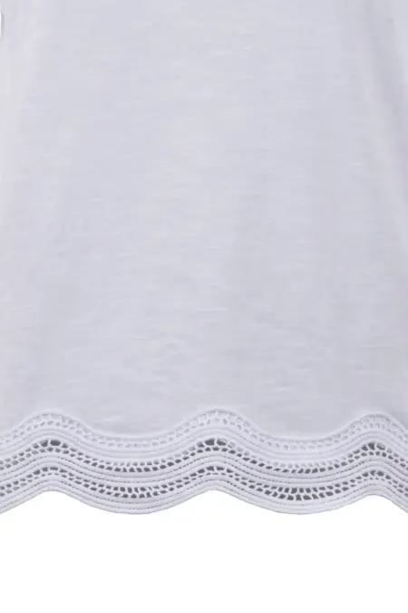 Komfortables T-Shirt aus 100% Baumwolle. Viele verspielte Details machen das Shirt zum perfekten Begleiter für sommerliche Outfits. Besonders sticht die Spitzenkante ins Auge und auch der Cut-Out am Rücken schafft einen femininen Look. Vervollständigt wird das Shirt mit einem zarten Lettering-Print auf der Brust.