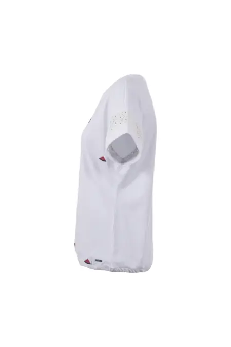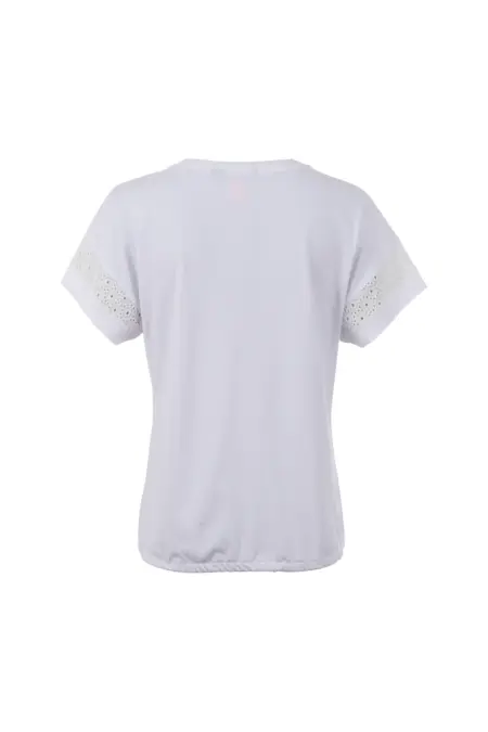 Rundhals T-Shirt mit überschnittener Schulter und Gummibund für eine ansprechende Silhouette. Zum Highlight in deinem Kleiderschrank machen dieses T-Shirt die süßen Melonenstickereien. Abgerundet durch die Spitzeneinsätze an den Ärmeln.