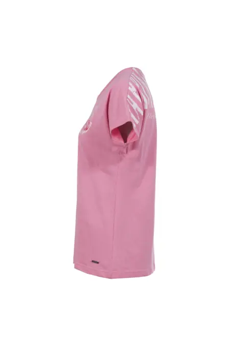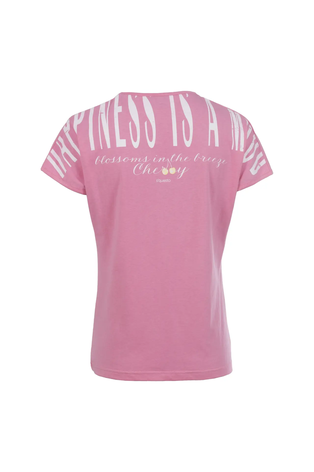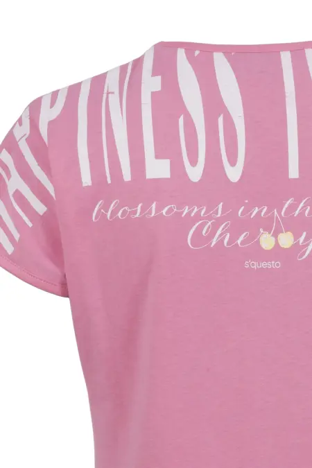 Modernes T-Shirt mit Rundhalsausschnitt und überschnittener Schulter. Der kleine Brustprint mit modischer Kirsche setzt einen frischen Akzent, während das großflächige Lettering auf dem Rücken dem Shirt eine sportive Note verleiht. Angenehm zu tragen und perfekt für lässige Freizeit-Outfits.