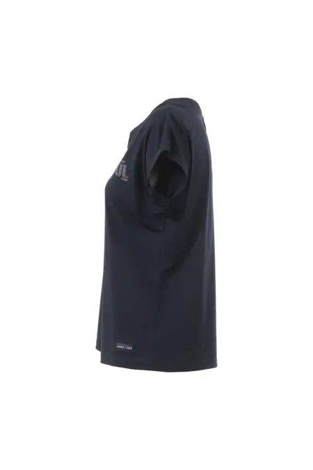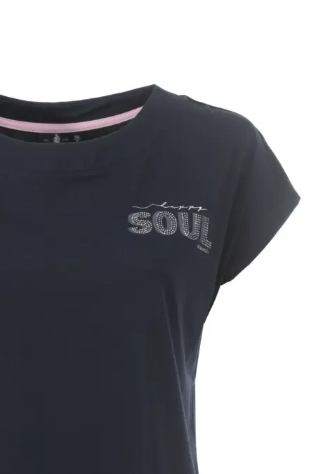 Legeres T-Shirt mit kleinem Strassmotiv auf der Brust. Außerdem mit außergewöhnlicher Nahtführung für einen einzigartigen Look. Durch die überschnittene Schulter entsteht eine feminine Silhouette.