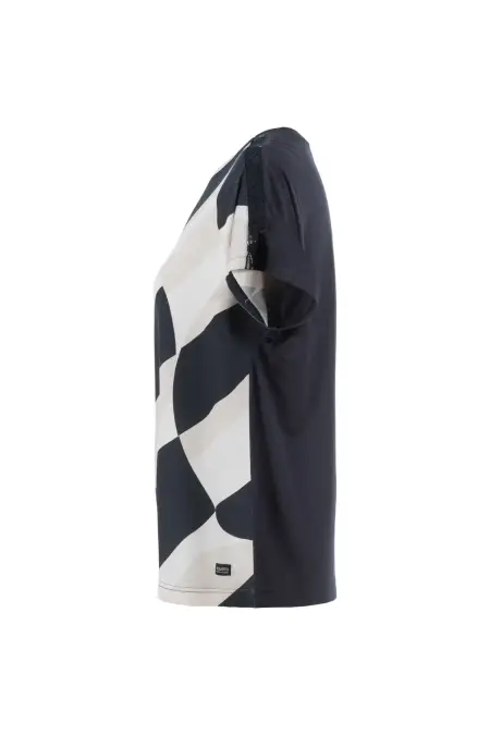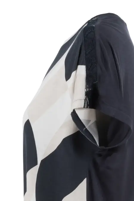 Gepflegtes T-Shirt mit überschnittener Schulter. Der grafische Allover-Print macht das Shirt zum Hingucker, abgerundet durch zarte Spitzeneinsätze an den Schultern. So ergibt sich ein femininer Look welcher zu verschiedensten Anlässen getragen werden kann.
