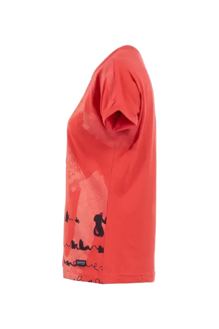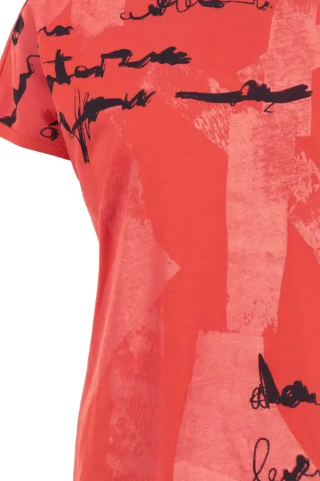T-Shirt mit überschnittener Schulter und großflächigem Frontprint in cooler Optik mit Farbakzenten. Durch die einfarbig gehaltene Rückseite ergibt sich ein harmonisches Gesamtbild.